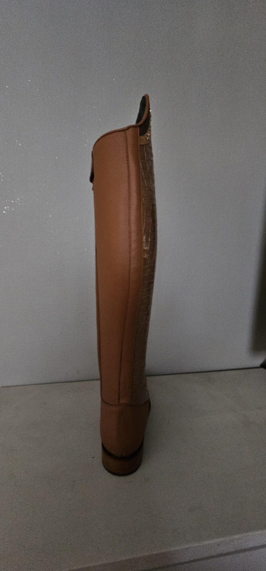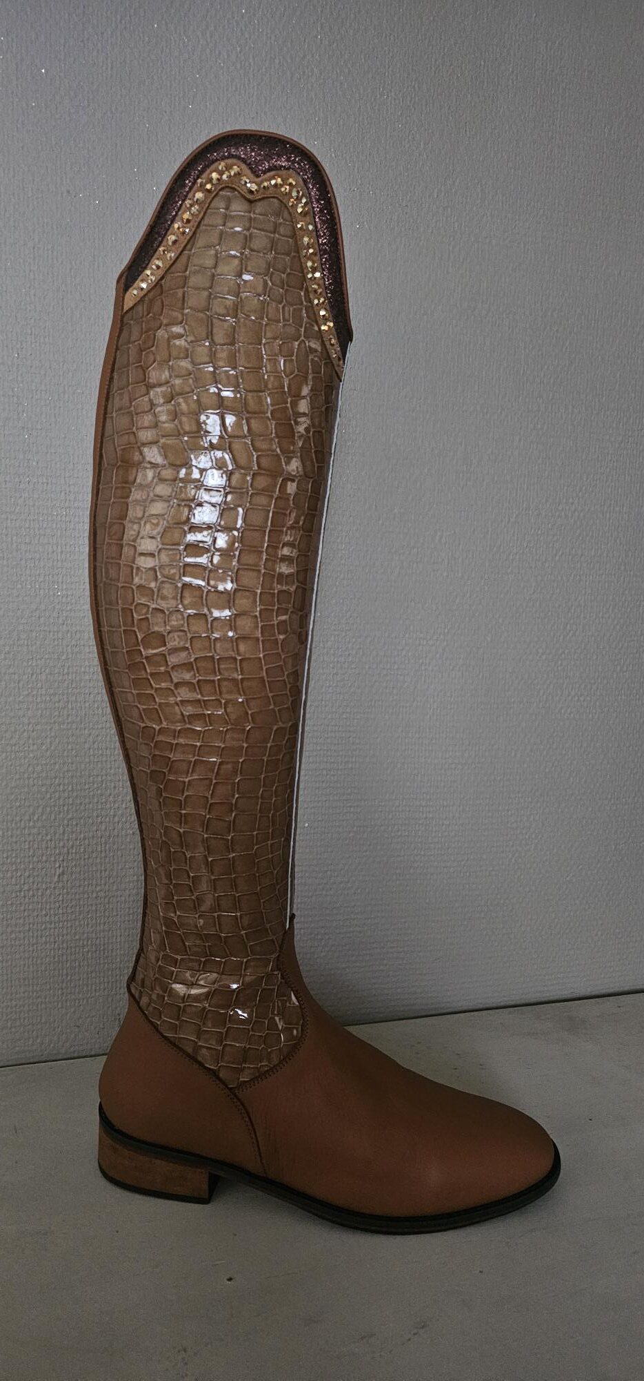 Croccolak caramel? binnen been en voet luxery leer , de top is van bronzo glitter en bronzo Swarovski steentjes.